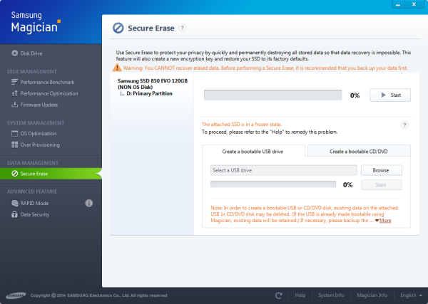 The Secure Erase feature provides the option to delete all data on an SSD in a way that it can never be recovered, restoring the drive to its original performance. Magician gives you the option to do this from within Windows. Otherwise, if your SSD is in a frozen state, you can create a bootable USB drive, CD or DVD.
