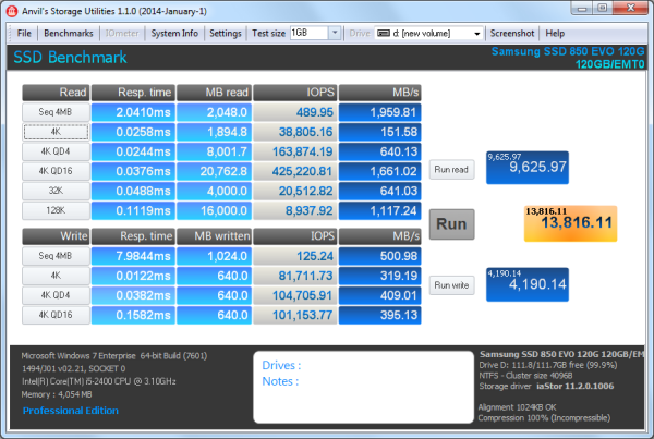 To test the performance of Samsung's 120GB SSD 850 EVO, I ran a series of benchmarks using CrystalDiskMark 3.0.1, HD Tach RW 3.0.4.0, ATTO Disk Benchmark 2.46, AS SSD, HD Tune Pro 4.61, Anvil's Storage Utilities and Iometer. For comparison, I've also included test results from the OCZ ARC 100, SanDisk Ultra II, Crucial MX100, SanDisk Extreme Pro, Samsung SSD 850 PRO, Plextor PX-256M6S, Toshiba Q Series Pro, Plextor PX-256M6M, Samsung SSD 840 EVO mSATA, OCZ Vector 150, OCZ Vertex 450, Silicon Power Slim S55, Samsung SSD 840 EVO, Seagate 600 SSD, SanDisk Extreme II, Plextor PX-256M5M, OCZ Vector, Plextor PX-256M5Pro Xtreme, Samsung SSD 840 Pro and Samsung SSD 840.