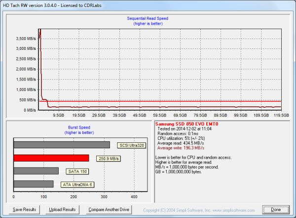Next, I used HD Tach to test the 850 EVO's read, write and burst speeds as well as its seek times and CPU usage.