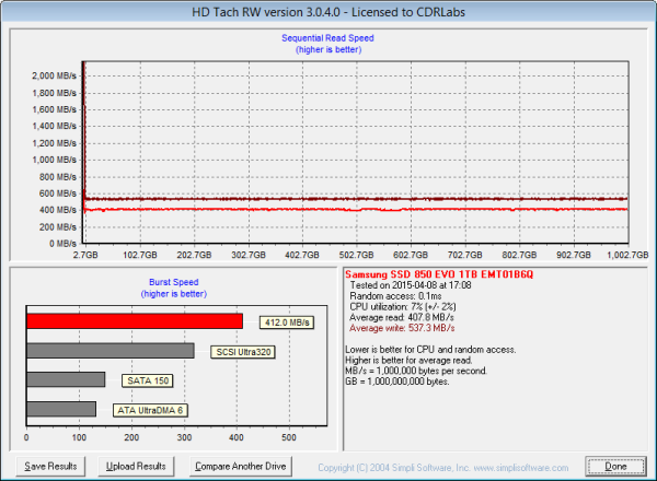 Next, I used HD Tach to test the 850 EVO's read, write and burst speeds as well as its seek times and CPU usage.