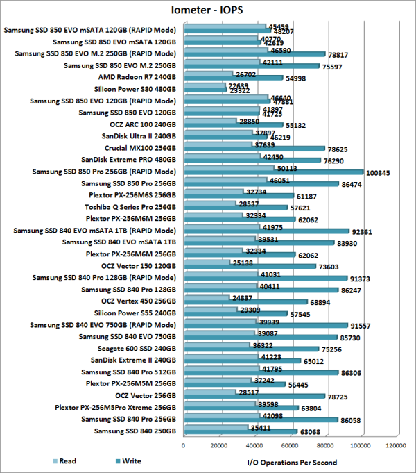 Lastly, I ran a series of tests using Iometer. This tool can be configured to benchmark a number of things. In this case, I used it to measure the 850 EVO mSATA's read and write speeds and the number of operations per second. The tests were run using random bytes and a queue depth of 3.