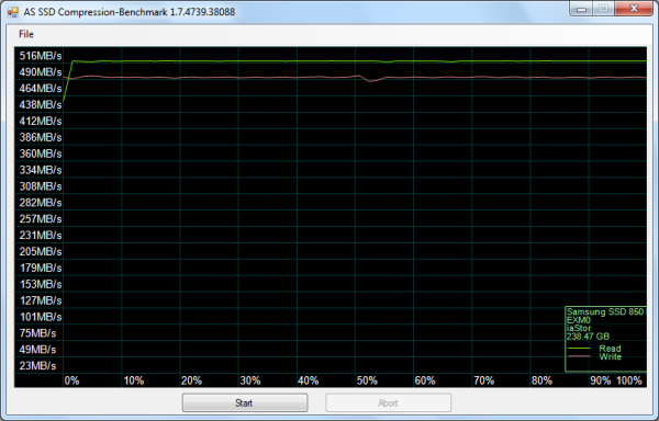 As I mentioned earlier, the 850 PRO is based on Samsung's MEX (S4LN045X01-8030) controller chip. Looking at the screenshot above, you can see that it performs equally well with both incompressible (0%) and compressible (100%) data.