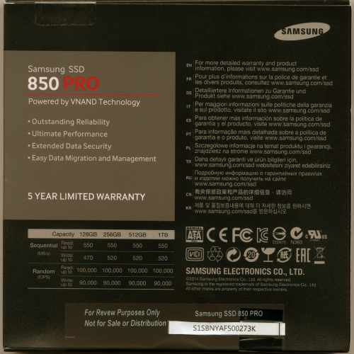 The 850 PRO comes in a small black box. While there aren't a lot of details on the front, the back of the box lists many of the drive's features as well as its specifications. Inside, you'll find the SSD, warranty statement, installation guide and a couple of "Samsung SSD Activated" stickers for your computer's case. According to Newegg, the drive is also supposed to come with a software and manual CD but for whatever reason, our drive did not come with one. Nevertheless, Samsung's SSD Magician and Data Migration software can be downloaded from their website.