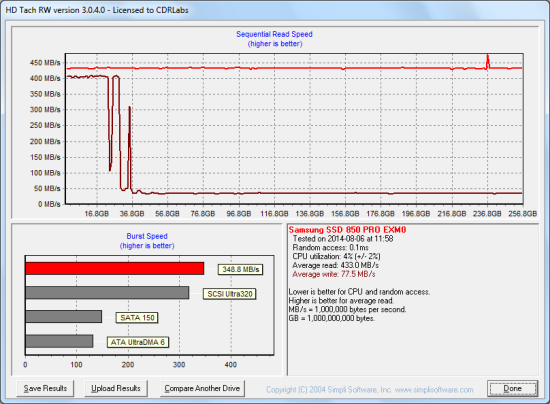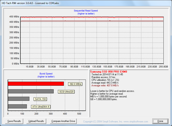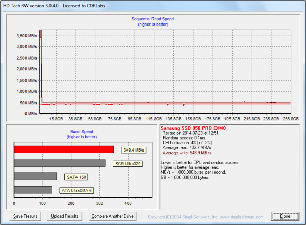 Next, I used HD Tach to test the 850 PRO's read, write and burst speeds as well as its seek times and CPU usage.