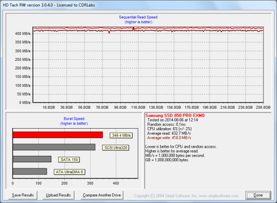 To see how well the 850 PRO could recover, I let the computer sit for about 15 minutes and then reran the test. Looking at the screenshot below, you can see that the drive's average writing speed jumped back up to 418.0 MB/s.