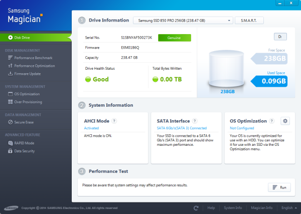 The Samsung Magician software is designed to help users easily manage the health and performance of their Samsung SSD. From the main screen, users can check the health of their drives and view information like the serial number, firmware, capacity and the total bytes written. This screen also shows whether or not AHCI mode has been activated as well as the speed of the SATA interface.