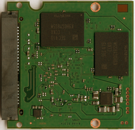 For the 256GB version of the 850 PRO, Samsung used their own 32-layer 3D V-NAND flash chips. Looking at the pictures above, you can see that there are two 64GB K9HQGY8S5M chips on either side of the PCB. The drive also has a single 512GB K4P4G324EQ-FGC2 LPDDR2 DRAM memory chip that is used for caching.