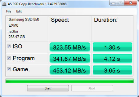 AS SSD also includes a copy benchmark. This test copies an ISO (two large files), program (many small files) and game (small and large files), returning the speed and duration of each.