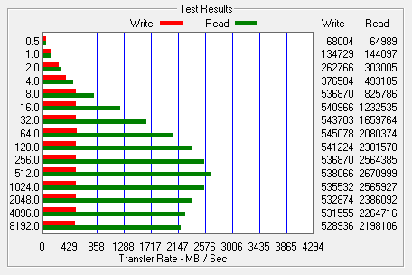 I also used ATTO Disk Benchmark to test the 850 PRO's sequential read and write speeds. The tests are run using blocks ranging in size from 0.5KB to 8192KB and the total length set to 256MB.