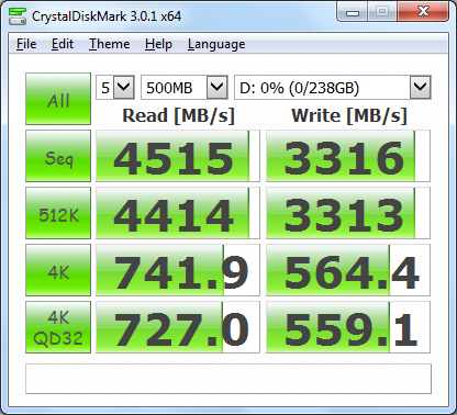 According to Samsung, the 256GB 850 PRO is capable of reading at 550 MB/s and writing at 520 MB/s when connected to a SATA 6 Gb/s port. While the drive performed well, it came up a bit short of these numbers in CrystalDiskMark's sequential read and write speed tests. With RAPID mode enabled, these numbers increased considerably. Looking at the screenshot above, you can see that the 850 PRO was able to read at 4,515 MB/s and write at 3,316 MB/s.