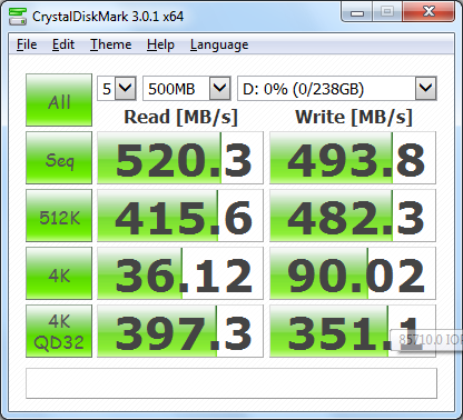 According to SanDisk, the Extreme PRO is capable of reading at 550 MB/s and writing at 515 MB/s when connected to a SATA 6 Gb/s port. While the drive performed well, it came up a bit short of these numbers in CrystalDiskMark's sequential read and write speed tests.