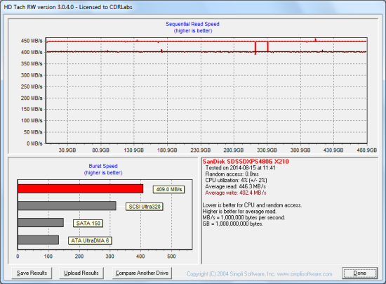 Next, I used HD Tach to test the Extreme PRO's read, write and burst speeds as well as its seek times and CPU usage.
