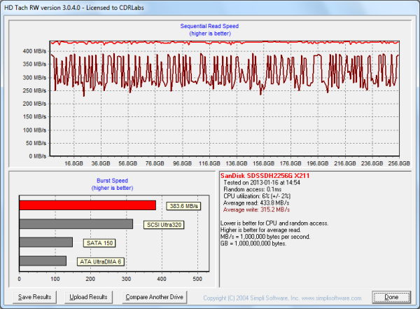 Looking at the screenshot above, you can see that the Ultra Plus had average read and write speeds of 433.8 MB/s and 315.2 MB/s respectively, as well as a burst speed of 383.6 MB/s.