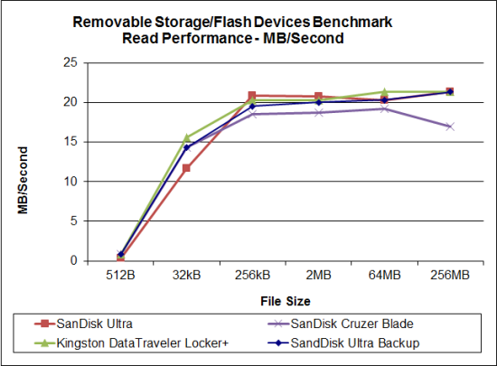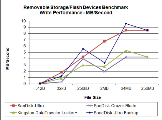 The SanDisk Ultra was a little slower than the other drives when reading 512B and 32kB files. Nevertheless, it performed very well when reading larger files, reaching a maximum speed of 21.33 MB/s.