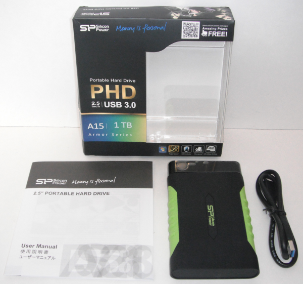 The Armor A15 comes packaged in a simple, yet attractive, black, blue and yellow box. The front advertises key features like the drive's 1TB capacity, USB 3.0 interface and shockproof outer casing. There is also a large, plastic window which lets you look inside the box and see what the drive looks like. The back of the box provides a bit more information, including the Armor A15's specifications, package contents and key features. Inside the box you'll find the drive as well as a USB 3.0 cable and User Manual.