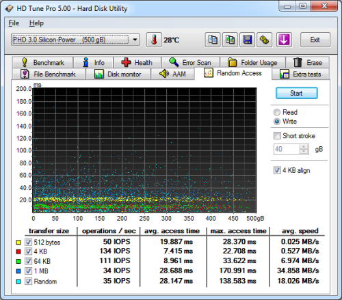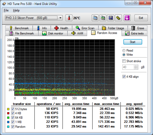 Next, I ran a series of tests using HD Tune Pro. This hard disk utility measures a drive's performance by testing its sequential read and write speeds as well as its access time, burst rate and CPU usage. For this review, I used it to benchmark the Diamond D20's random read and write speeds, random access times and the number of operations per second.