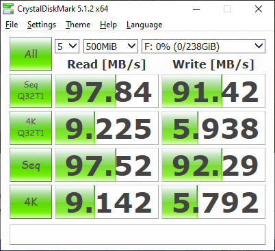 First, I ran a few quick tests using CrystalDiskMark. This benchmark tool measures the performance of a storage device by testing its sequential read and write speeds as well as its random read and write speeds using blocks 512K and 4K in size.