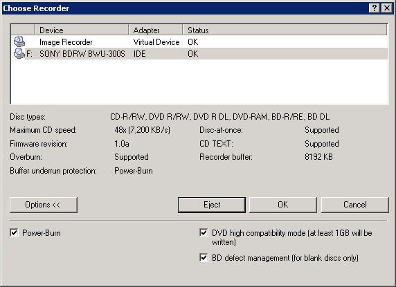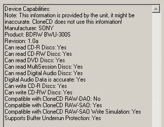 The Nero screenshot also shows that the BWU-300S has a maximum CD writing speed of 48x and a 8192KB buffer. This buffer is also backed up by Sony's Power-Burn buffer underrun protection. According to Nero, the BWU-300S can write CD-Text and overburn. When testing the drive's capacity, it had no problems overburning up to 99 minutes with our CompUSA media.
