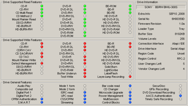 While InfoTool gives us a quick glance at the BWU-300S's features, DVDINFOpro provides a little more information on some of the drive's reading and writing capabilities. By looking at the screenshot above you can see that Sony's new drive can read and write to most BD and DVD formats.