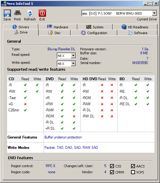 InfoTool also shows that the BWU-300S is an RPC-2 DVD drive. This means that the drive's region is stored in the firmware. The drive's region can be changed five times and after that it cannot be changed anymore. Unfortunately, a patched RPC-1 firmware is not yet available for this drive.