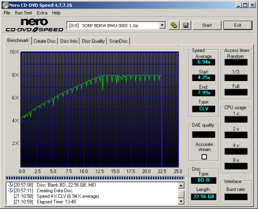 The BWU-300S is one of the first drives that can write to both BD-R and BD-R DL media at 8x. Looking at the screenshots above, you can see that the drive starts writing at 4x and then accelerates, reaching 8x at the 13GB mark.