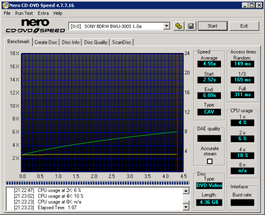 BD Read Tests: For the read performance section of the BD benchmarks, CD Speed v4.7.7.16 is used to test read speeds, seek times, and CPU usage.
