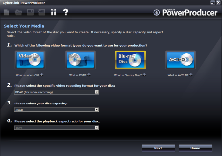PowerProducer lets you create a number of different movie discs. Looking at the menu below, you can choose from a number of video format types including VCD, DVD, Blu-ray Disc and AVCHD. The software also supports various disc capacities and specific video recording formats such as DVD-VR, DVD+VR and BDAV.