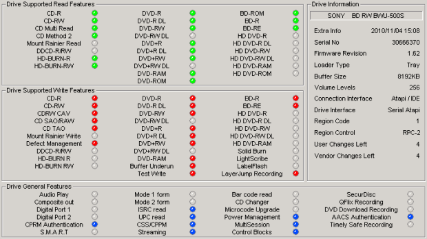 While Opti Drive Control gives us a quick glance at the BWU-500S's features, DVDINFOpro provides a little more information on some of the drive's reading and writing capabilities. By looking at the screenshot above you can see that Sony's new drive can read and write to most BD and DVD formats.