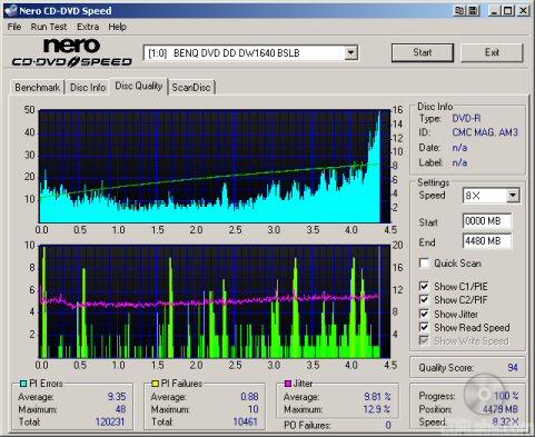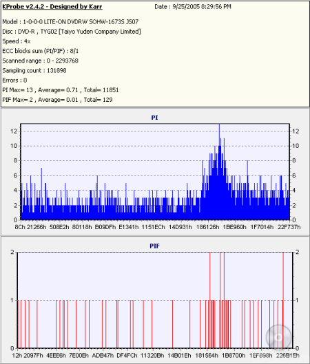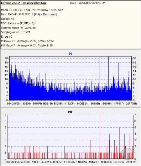 So what about writing quality? Testing a drive's DVD writing quality isn't easy. Until now, there were very few options, unless you wanted to shell out thousands of dollars for a certified test machine. Thanks to KProbe, we can test a disc's PI (Parity Inner) and PIF (Parity Inner Fail) rates.For these tests I used a Lite-On SOHW-1673S (firmware JS07) and read the discs at 4x with the PI and PIF ECC sums set to 8 and 1 respectively. For comparison, I also tested the discs on a BenQ DW1640. When combined with Nero CD Speed, the DW1640 is able to report PI Errors, PI Failures, Parity Outer Failures and even jitter levels. For this test, the discs are read at 8x with both the PI and PIF ECC sums set to 8.