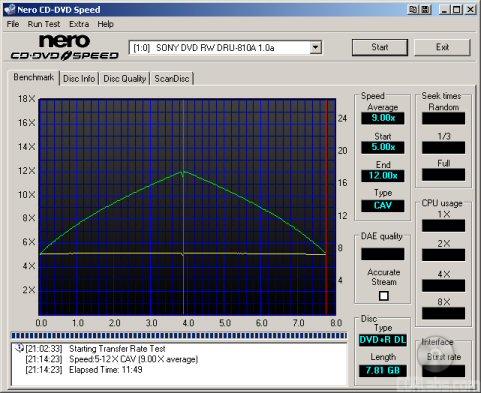According to Sony, the DRU-810A writes to DVD+R DL media at 8x. Using CD Speed, we can see that the drive uses P-CAV to reach this speed. It starts rewriting at about 6x and accelerates, reaching its maximum speed at about the 0.5GB mark. It writes at this speed until it reaches the 7.5GB mark. At this point, the DRU-810A slows back down to about 6x.