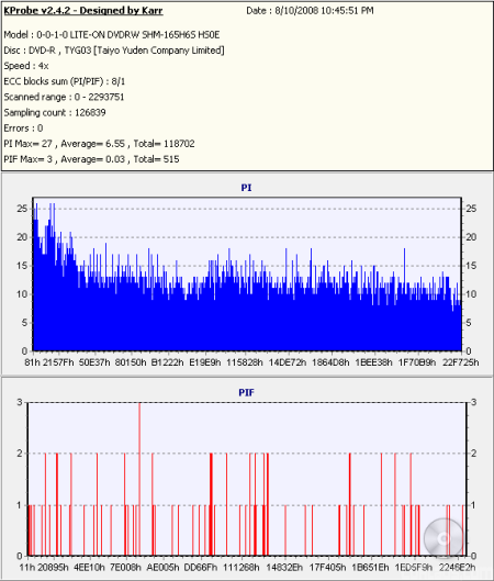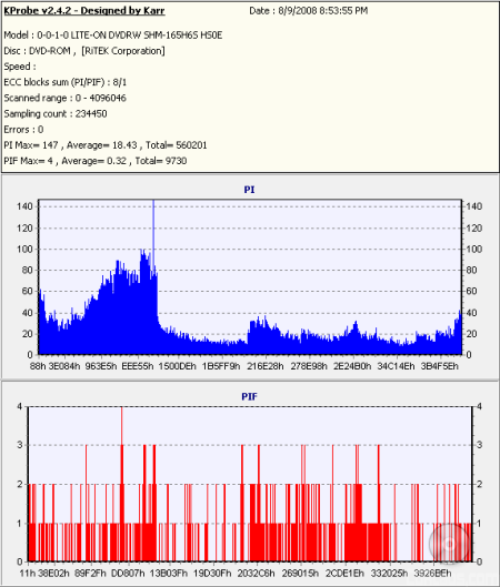 So what about writing quality? Thanks to KProbe, we can test a disc's PI (Parity Inner) and PIF (Parity Inner Fail) rates.For these tests I used a Lite-On SHM-165H6S (firmware HS0E) and read the discs at 4x with the PI and PIF ECC sums set to 8 and 1 respectively. For comparison, I also tested the discs on a BenQ DW1640. When combined with Nero CD Speed, the DW1640 is able to report PI Errors, PI Failures, Parity Outer Failures and even jitter levels. For this test, the discs are read at 8x with both the PI and PIF ECC sums set to 8.