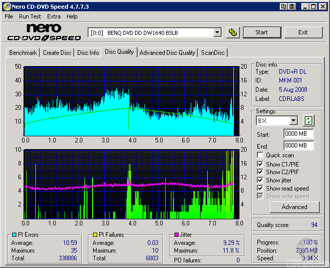 The writing quality was pretty good with Verbatim's 2.4x and 8x DVD+R DL media. Aside from a few isolated spikes, the PI/PIF rates stayed within acceptable limits. Unfortunately, the results weren't as good with the 8x DVD+R DL media from Philips and Memorex. When scanned with the BenQ DW1640, the error and jitter rates were very high at the layer change.