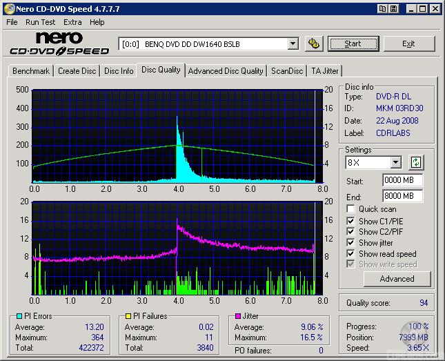 While the writing quality was very good with Verbatim's 4x DVD-R DL media, their 8x rated discs yielded some mixed results. The error rates stayed within acceptable limits when tested with KProbe. However, when scanned by the DW1640, the PI and jitter rates were higher than we'd like to see.