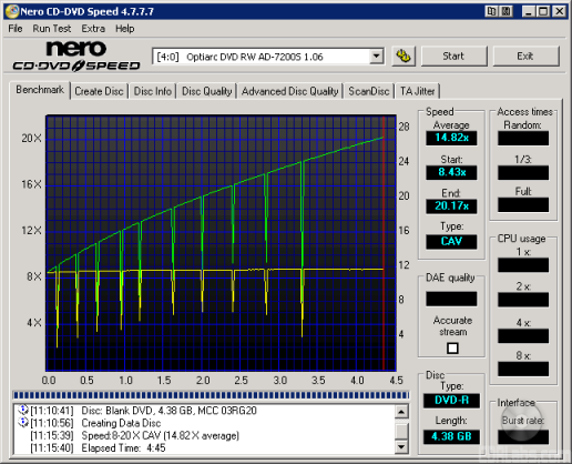 When writing to DVD+R and DVD-R media at 20x, the AD-7200S uses CAV. By looking at the screenshots above, you can see that Optiarc's new drive starts writing at about 8.3x and accelerates, reaching its maximum speed at the end of the disc.