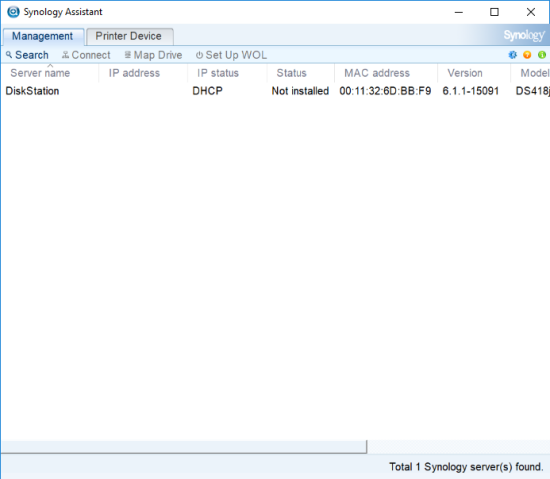 The Assistant utility searches the network looking for Synology NAS devices. When it finds one, it will display its host name, IP address, MAC address, model, firmware version and status. To configure the device, select it from the list and click "Connect." The Assistant utility will then launch your default browser and automatically connect you to the web assistant so that you can go through the setup process.