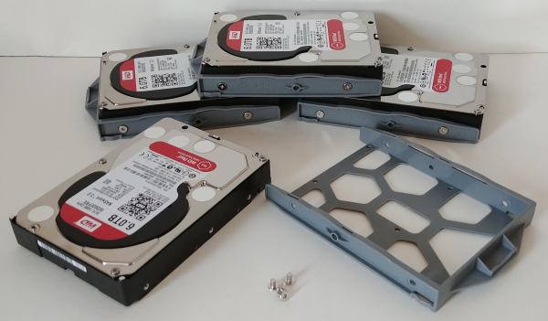 Before using the DS418j you will need to install a couple of hard drives or SSDs. To begin, remove the four trays from the device and mount the drives to them using the included screws. When you are done, slide the trays back into the empty drive bays.
