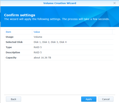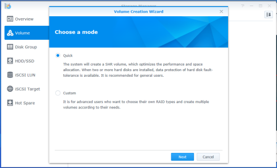 Creating a volume on the DS418j is pretty straight forward. The Volume Creation Wizard gives you two creation methods: Quick and Custom. The Quick option is recommended if you're short on time or you want to simplify your storage management. This option creates an SHR (Synology Hybrid RAID) volume and will automatically optimize capacity and performance based on member hard disks. If you're looking for more precise control of your storage, you'll want to go with the Custom option which offers support for different RAID types and lets you create single or multiple volumes.