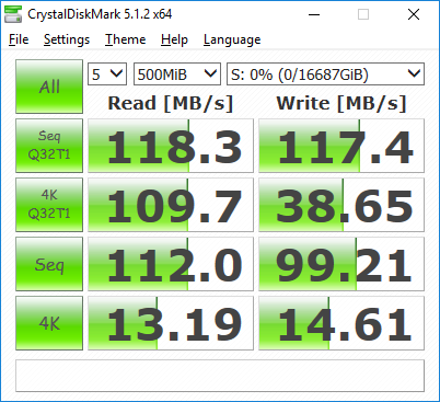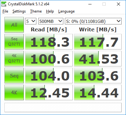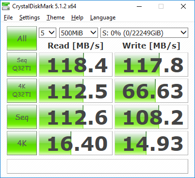First, I ran a few quick tests using CrystalDiskMark. This benchmark tool measures the performance of a storage device by testing its sequential read and write speeds as well as its random read and write speeds using blocks 4KB and 512KB in size.