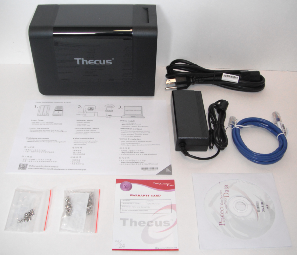 Inside the box you'll find the N2310 as well as an AC power cord and adapter, ethernet cable, quick installation guide, two bags of screws, warranty card and a DVD which contains documentation and software.
