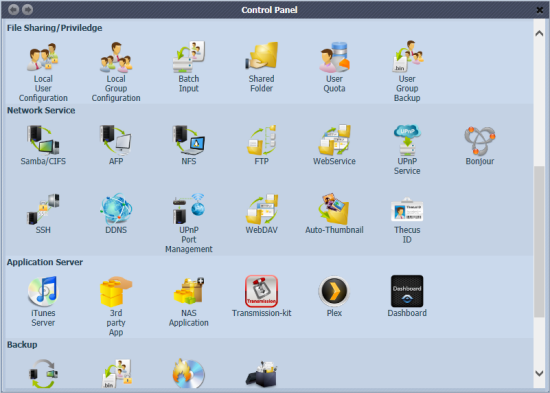 The N2310 ships with ThecusOS 6 which is the latest version of Thecus's NAS operating system. While ThecusOS 6 does not let you have multiple windows open nor do multiple tasks at once, its interface is easy to navigate and use. From within the Control Panel, you can manage storage, set user privileges, configure the various applications and network services, and perform both local and network backups.