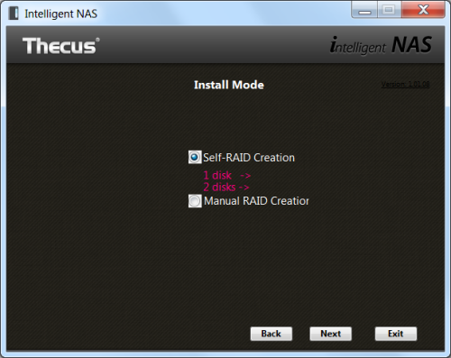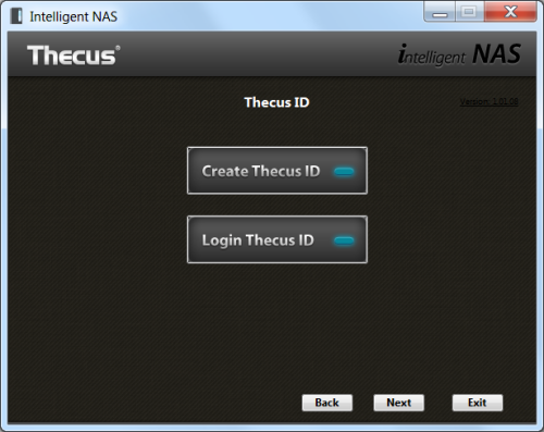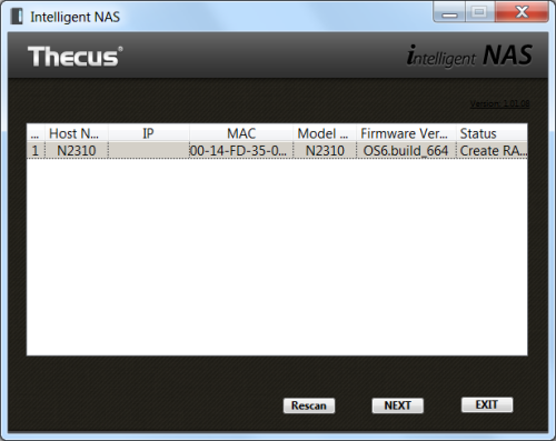 The Intelligent NAS utility searches the network looking for Thecus NAS devices. When it finds one, it will display its host name, IP address, MAC address, model, firmware version and status. To configure the device, select it from the list and click the "Next" button. From here, the Intelligent NAS utility walks you through the RAID creation process and system initialization. If you want, you can also login using your Thecus ID and create a DDNS address that can be used to access the NAS remotely.