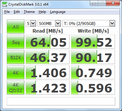 According to Thecus, the N2310 is able to read at 100 MB/s and write at 80 MB/s. While the device performed better than expected when writing, it came up well short of its rated speed in CrystalDiskMark's sequential read speed test.