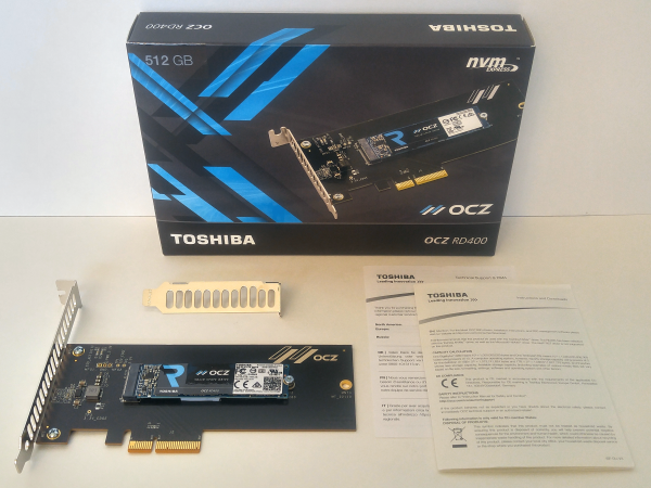 The RD400 is available with or without a PCIe adapter add-in-card. For this review, Toshiba sent us the version with the card, which includes both full and half height brackets. The drive also comes with a small instruction manual as well as a sheet of paper with information on how to reach Toshiba's tech support.