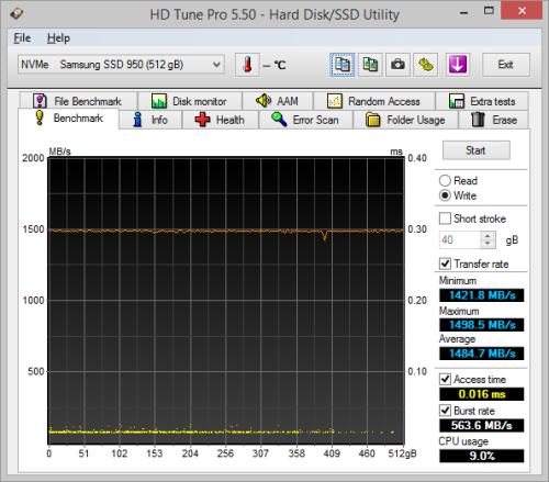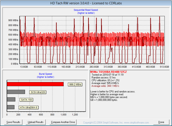 The RD400's performance was hit and miss when tested with HD Tach. While the drive was able to write at 1,380.4 MB/s, its read speed averaged out at only 899.9 MB/s.
