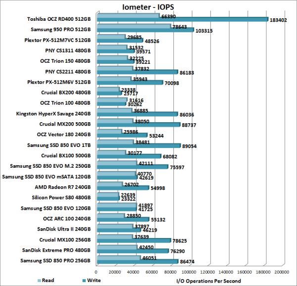 To test the performance of Toshiba's OCZ RD400 SSD, I ran a series of benchmarks using CrystalDiskMark, HD Tach RW, ATTO Disk Benchmark, AS SSD, HD Tune Pro, Anvil's Storage Utilities, Iometer and PCMark 8. For comparison, I've also included test results from the Samsung 950 PRO, Plextor M6V, Crucial BX200, OCZ Trion 100, Kingston HyperX Savage, Crucial MX200, OCZ Vector 180, Kingston BX100, Samsung 850 EVO M.2, Samsung 850 EVO mSATA, AMD Radeon R7, Silicon Power Slim S80, Samsung SSD 850 EVO, OCZ ARC 100, SanDisk Ultra II, Kingston MX100, SanDisk Extreme Pro and Samsung SSD 850 PRO.