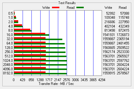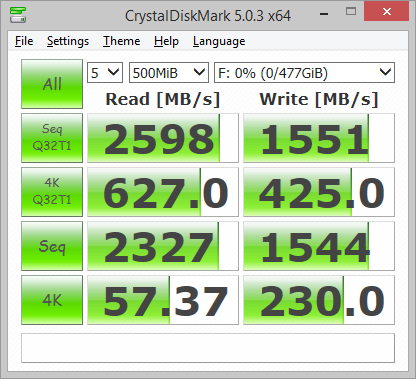 The RD400's performance was very similar to what we saw in our other tests. The drive was able to read at 2545.66 MB/s and write at 1476.35 MB/s.