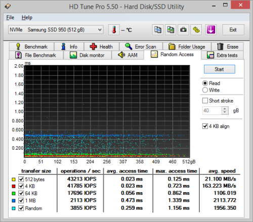 The RD400 didn't disappoint when doing random reads and writes. When reading 4KB blocks, the drive reached 47,194 IOPS and had an average speed of 184.353 MB/s. It was even faster when writing, reaching 52,700 IOPS with an average speed of 205.863 MB/s.