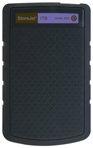 On top of the StoreJet 25H3P you can see its OneTouch auto-backup button, which lets users instantly synchronize data with their computer. This button also has a bright blue LED that will light up when the drive is powered on and flash to show when data is being transferred.
