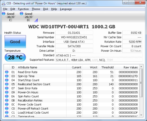 I wasn't able to crack the StoreJet 25H3P open. However, using CrystalDiskInfo, I was able to see what hard drive was in the enclosure. Looking at the screenshot below, you can see that Transcend has used Western Digital's Scorpio Blue (WD10TPVT) hard drive. This drive features a SATA 3.0Gb/s interface, 8MB cache and a 5200 RPM rotation speed.
